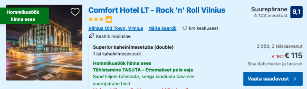 Kui otsid soodsa hinnaga majutust Vilniuses või Varssavis, siis soovitame parima ülevaate ja hinna saamiseks kasutada hotellihindade võrdlusportaali Booking.com