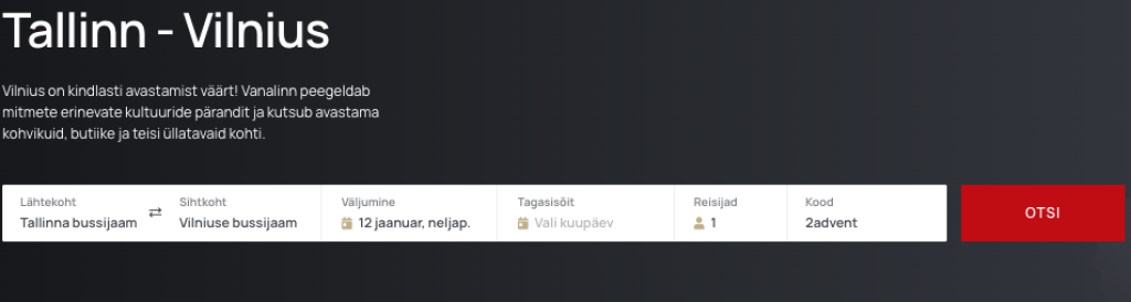 Broneerimisel tuleb kasutada kampaaniakoodi " 2advent " ning soodustus lisandub otsimisel piletitele automaatselt. Reisiperioodiks on vahemik 12.12.2022 - 28.02.2023(välja arvatud 23.12-02.01, kus piletid on vaid mõnevõrra kallimad) ning soodushinnaga pileteid saab soetada kuni 10.12.2022.