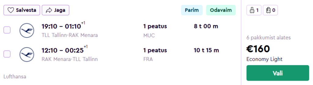 Lufthansa koostöös SWISSiga pakuvad hetkel väga hea hinnaga lennupileteid Marokosse. Edasi-tagasi lennupiletid Tallinnast Marrakechi on saadaval alates 160€ eest.