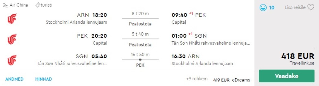 Hetkel on saadaval väga hea hinnaga multi-city lennupiletid sügiseks ja talveks Vietnamisse! Air China lennupiletid Stockholmist (paaripäevase peatusega Pekingis) Ho Chi Minh Citysse on saadaval alates 418€ eest ning valikus on ohtralt soodsaid lennupileteid oktoobrist märtsini. Piletiteni jõudmiseks kliki allolevatel näidiskuupäevadel või kontrolli endale sobivaid kuupäevi läbi - momondo multi-city otsingu.