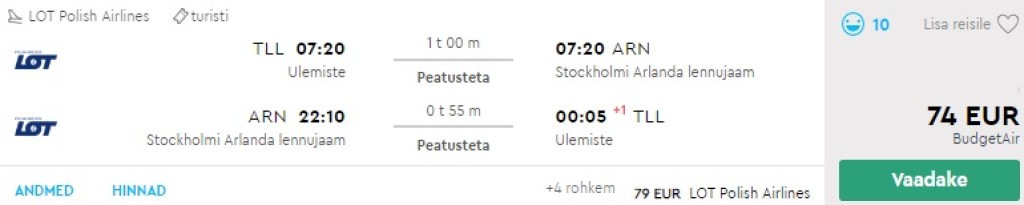 Ajaliselt sobivad lennupiletid Nordicaga Tallinnast Stockholmi on saadaval al 74€ eest (äraantav pagas hinnas).