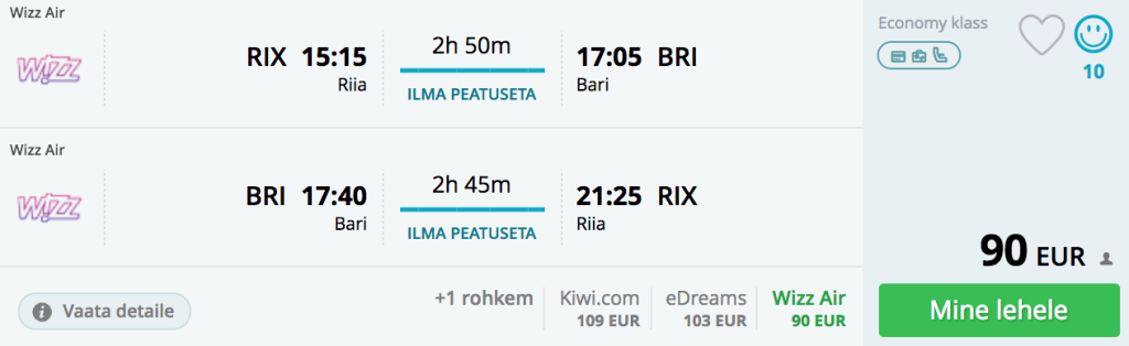 Lennupiletid Riia-Bari-Riia 90€