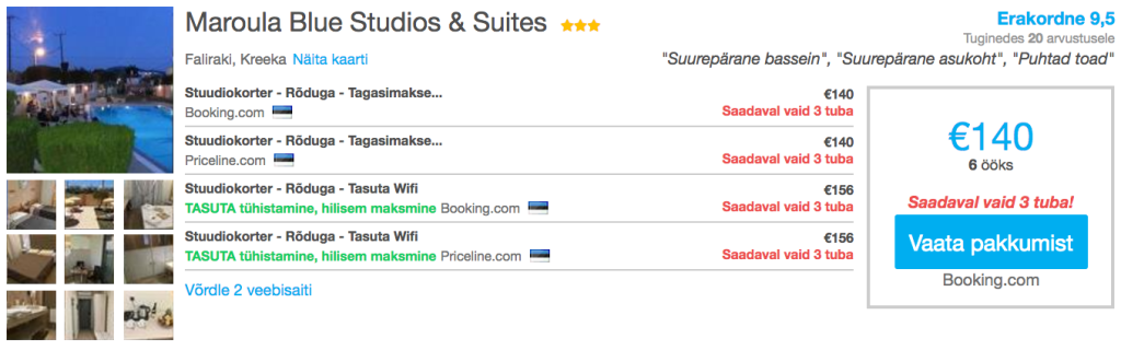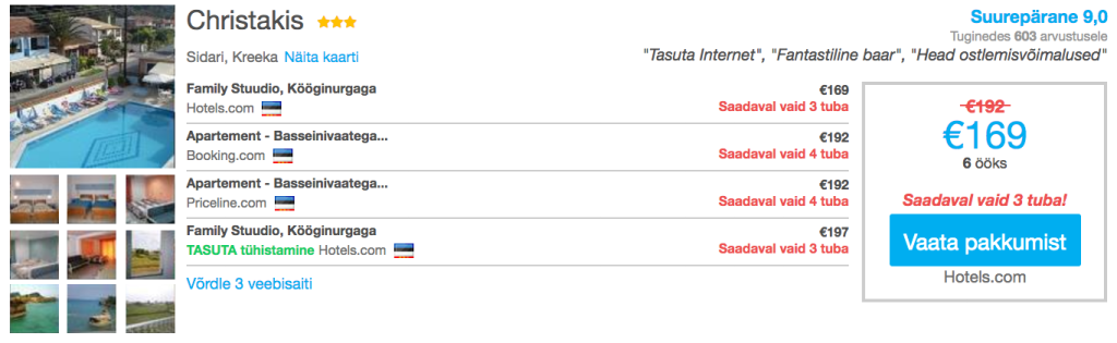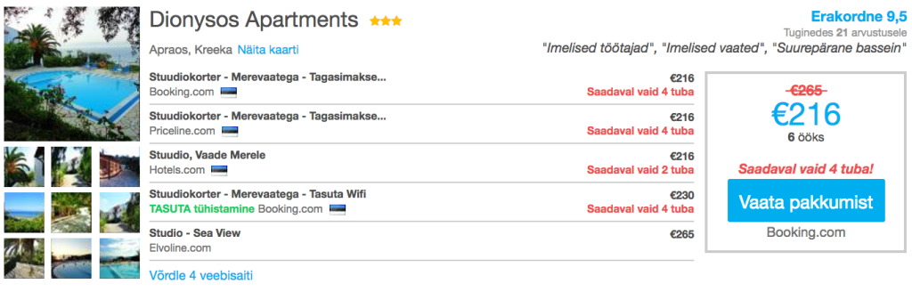 Otsisime välja võimalused veeta soodsalt nädalane puhkus Korful. Lennupiletid Tallinnast Korfule on saadaval vaid 161€ eest ning soodsaima hotelli kahele leiab 169€ eest. Hetkel varakult ette broneerides leiab väga hea hinnaga öömaja läbi hotellide hinnavõrdlusportaali HotelsCombined.ee