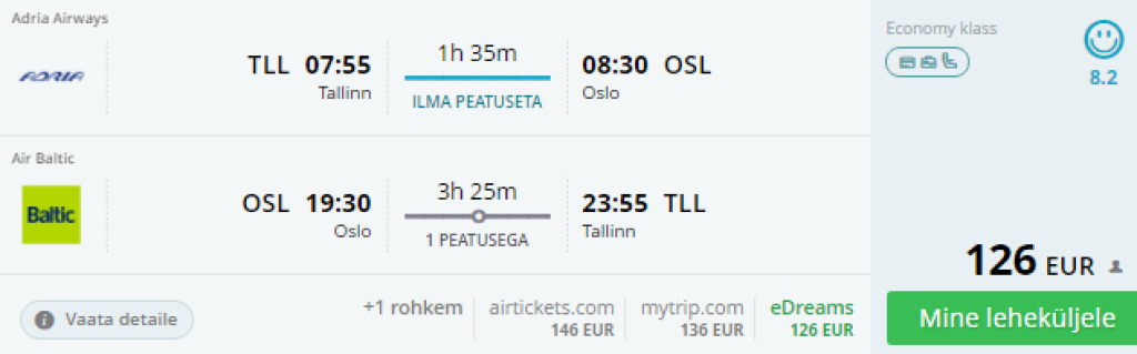 Edasi-tagasi lennud Tallinnast Oslosse leiab alates 126€