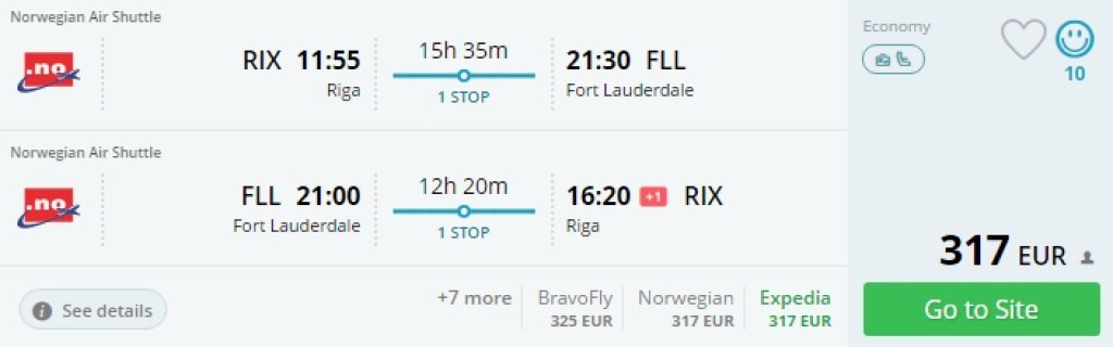 Norwegian pakub ühe ümberistumistega lende Riiast ja Helsingist Floridasse Fort Lauderdale’i hinnaga al. 298€. Riiast on piletid vaid üige pisut kallimad, kuid see-eest kiiremate ümberistumistega. Piiratud hulga lennukuupäevi leiab jaanuarist juunini.