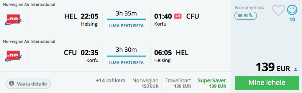 Norra päritolu odavlennufirma Norwegian pakub hetkel väga hea hinnaga lennupileteid suveks otselendudele Helsingist Korfu saarele! Edasi-tagasi lennupiletid juunis ning juulis on saadaval alates 139€ eest. Lennud Helsingist toimuvad hiliõhtul ning tagasilend Helsingisse jõuab varahommikul, seega saab ilusti Helsingisse lennule minna mõnda laevaoperaatorit kasutades. Soodsa hinnaga lennupiletid leiab üles läbi Momondo