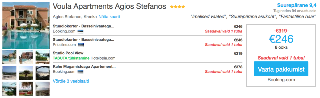 Otsisime välja võimalused veeta soodsalt nädalane puhkus Korful. Lennupiletid Helsingist Korfule on saadaval vaid 139€ eest ning väga hea reitinguga hotelli kahele (8ööd) leiab 236€ eest. Hetkel varakult ette broneerides leiab väga hea hinnaga öömaja läbi hotellide hinnavõrdlusportaali HotelsCombined.ee