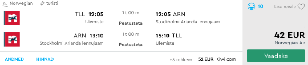 Norwegian pakub hetkel suurepärase hinnaga lennupileteid Tallinnast Stockholmi. Lennupiletite hinnad on saadaval vaid 10€ eest ning edasi-tagasi lennupiletite hinnad 42€. Saadavus on suurepärane alates novembri lõpust kuni märtsi lõpuni välja. Samuti leiab ohtralt variante veetmaks Stockholmis pikk nädalavahetus või miks mitte ka aastavahetus ja talvine koolivaheaeg. Lisaks tasub kaaluda ka variante tulemaks tagasi Tallinna lennuki asemel hoopis mõne laevakruiisiga.