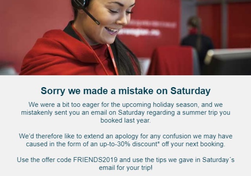 Norwegian saatis laupäeval laiali massiliselt e-maile, milles jagati inimestele soodsaid reisinippe tulevase suvise reisi kohta. Viga seisnes aga selles, et sinu "tulevane reis" oli hoopis juba toimunud eelmisel suvel. Eile õhtul saadeti uus e-mail, millega ülesköetud reisikirge pisut maandada ning öelda: "Palun vabandust, aga teie suvist reisi ikkagi ei toimu." Tehtud vea heastamiseks andis Norwegian välja sooduskoodi, mille alusel saab väga paljudelt lennupiletitelt soodustust kuni 30%. Sooduskood on FRIENDS2019. Allpool leiad mõned näited soodsatest lennupiletitest. Lennupiletite ostmiseks ja sooduskoodi kasutamiseks mine https://www.norwegian.com/en .