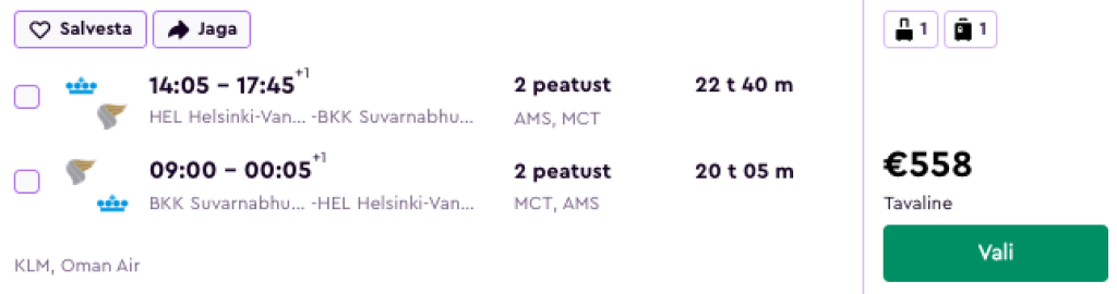 Oman Air koostöös KLMi ja Lufthansaga pakuvad hetkel suurepärase hinnaga lennupileteid Taisse. Kiirete ümberistumisega lennupiletid Helsingist Bangkokki on saadaval alates 558€ eest ning lennupiletite hinnas sisaldub ka äraantav pagas.