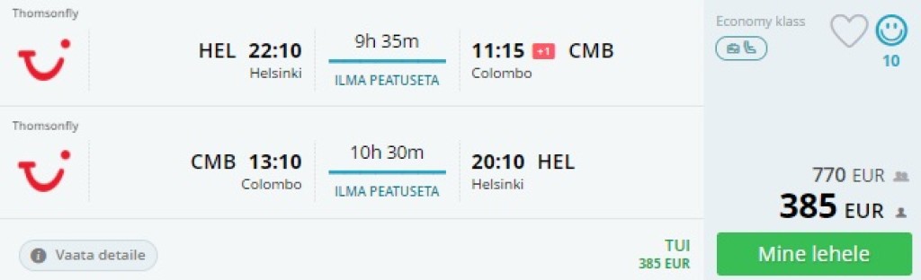 TUI pakub hetkel väga hea hinnaga lennupileteid Helsingist Sri Lankale. Edasi-tagasi lennupiletid on saadaval alates 385€ eest ning tegemist on otselendudega vahemikus 06.03-21.03. Soodsate lennupiletite ülesleidmiseks kasuta otselinke allpool või sisesta lennukuupäevad momondosse.