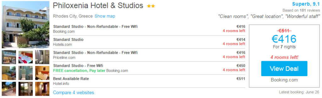 Hetkel võid leida antud kuupäevavahemikuks heade reitingutega öömajasid kahele Rhodos City's. Järgnevalt mõned näited: