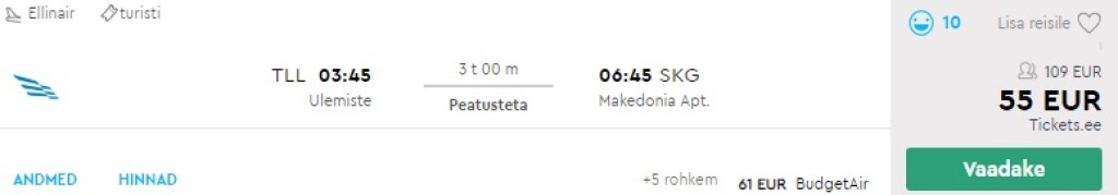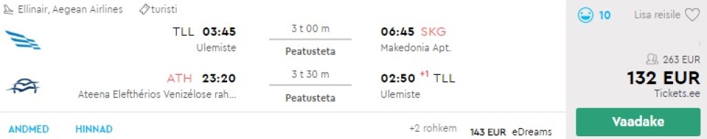 Hetkel võid leida Ellinairi hooaja viimase otselennu Tallinnast Thessalonikisse vaid 55€ eest. Sobitades sinna juurde tagasilennu Aegeaniga Thessalonikist Tallinnasse võid broneerida edasi-tagasi lennupiletid suvepikenduseks Tallinnast Thessalonikisse 148€ eest. Võimalik on valida ka tagasilend näiteks Ateenast (132€). Ellinairi lennupileti hinnas sisaldub äraantav pagas. _Kõik väljatoodud hinnad on vaikimisi kahele reisijale. _