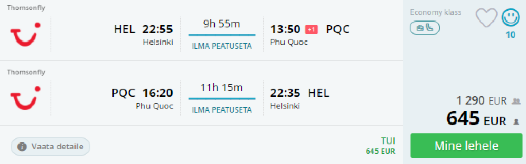 Soome reisikorraldaja TUI pakub hetkel väga hea hinnaga lennupileteid aastavahetuseks Helsingist Vietnamisse, Phu Quoc'i saarele. Edasi- tagasi lennupiletid maksavad al 645€ ning tegemist on otselendudega. Piletiteni jõudmiseks leidmiseks kasuta otselinki allpool või otsi lennupiletid üles momondo abil. Parima hinnaga hotellipakkumised selleks ajaks leiad üles otsides läbi Hotelscombined.ee.