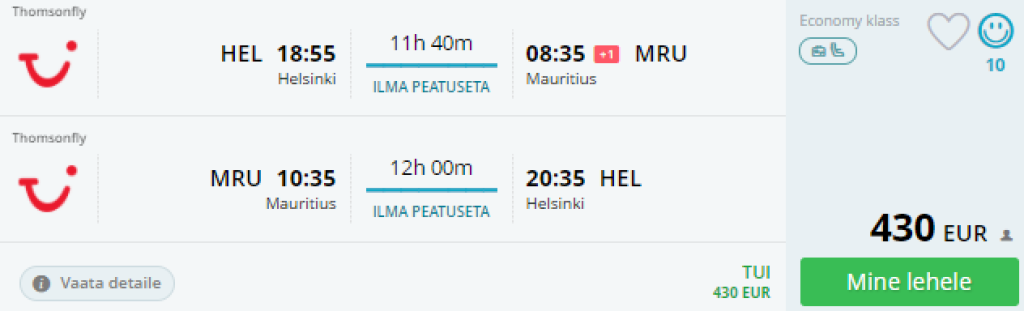 TUI pakub hetkel väga hea hinnaga lennupileteid Helsingist Mauritiusele. Edasi-tagasi lennupiletid on saadaval alates 430€ eest ning tegemist on otselendudega. Saadaval soodsad lennupiletid kaheks nädalaks vahemikus 24.01-08.02. Soodsate lennupiletite ülesleidmiseks kasuta otselinki allpool või siesta lennukuupäevad momondosse.