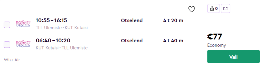 Hetkel võid leida väga hea hinnaga lennupileteid Gruusiasse. Edasi-tagasi lennupiletid Tallinnast Kutaisisse on saadaval alates 77€ eest ning Riiast alates 67€ eest. Soodsa hinnaga lennupileteid otselendudele leiab reisimiseks mais-juunis. Piletiteni jõudmiseks kliki allolevatel näidiskuupäevadel või kontrolli endale sobivaid kuupäevi läbi Momondo.ee