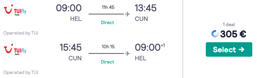 Soome reisikorraldaja TUI pakub hetkel hea hinnaga lennupileteid otselendudele Helsingist Mehhikosse. Edasi-tagasi lennupiletid Helsingist Cancuni vahemikus 01.03-15.03 on saadaval 305€ eest. Lennupiletiteni jõudmiseks kliki allolevatel näidiskuupäevadel.