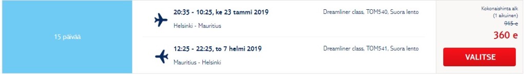TUI kodulehelt leiad hetkel väga hea pakkumise kahenädalaseks reisiks Mauritiusele. Edasi-tagasi lennupileti hind Helsingist on hetkel al 360€. Piletiteni jõudmiseks kliki allolevatel kuupäevadel. Soodsaima hinna sees on vaid käsipagas!