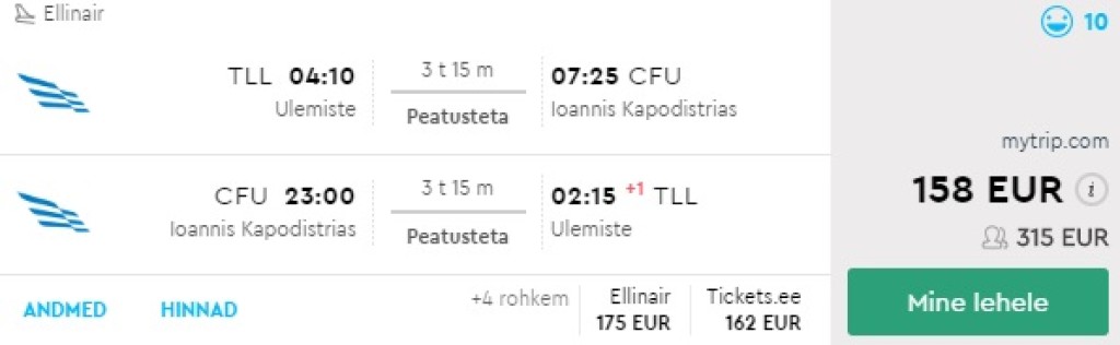 Ellinair pakub hetkel hea hinnaga lennupileteid Korfu saarele. Edasi-tagasi lennupiletid Tallinnast on saadaval alates 158€ eest. Saadaval on soodsad lennupiletid augusti lõpus- septembris. Lennupiletite hinna sees sisaldub nii toitlustamine Ellinairi pardal kui ka äraantav pagas! Tutvu saadaolevate lennukuupäevadega allpool.