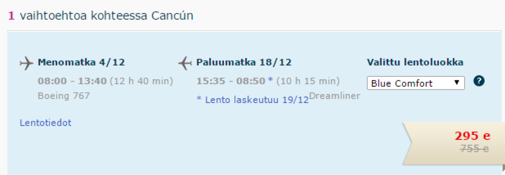Soome reisikorraldaja Finnmatkat pakub hetkel väga soodsaid lennupileteid Helsingist Cancuni. Edasi- tagasi hinnad al 295€. Reis vahemikus 04.12-18.12. Antud lennupiletid leiad aadressil http://www.finnmatkat.fi/hae-matka või kasuta otselinki allpool.