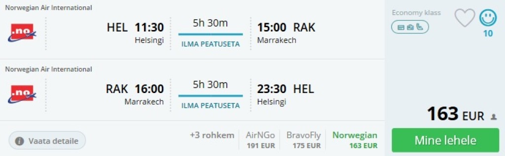 Norwegian pakub talvekuudel otselende Helsingist Marokosse Marrakechi hinnaga 163€ (edasi-tagasi). Lennud väljuvad laupäeviti.
