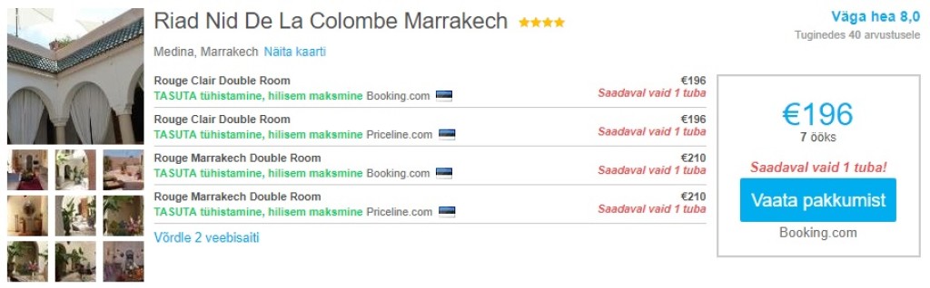 **Lennupiletid**Tegemist on näidiskuupäevadega. Novembrist märtsi alguseni saab Marrakechi lennata ka teistel laupäevastel lendudel. Broneeri piletid toodud linkide kaudu või vaata hindu teistel kuupäevadel [Momondos](http://tc.tradetracker.net/?c=23368&m=12&a=258453&u=%2F%3Fsimigvis%3Dnull%26currency%3DEUR%26plr%3Dfalse).HotellidHotellide hindu võrdle hinnavõrdlusportaalis Hotelscombined.