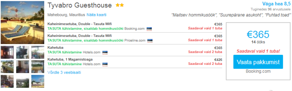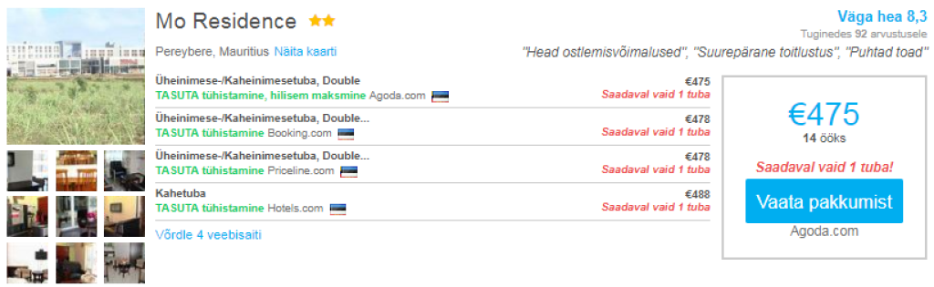 Kui otsid soodsa hinnaga öömaja Mauritiusel, siis soovitame parima ülevaate ja hinna saamiseks kasutada hotellihindade võrdlusportaali Hotelscombined.ee Järgnevalt mõned näited soodsatest saadaolevatest pakkumistest vahemikus 14.12-28.12 (vastavad lennupiletid SIIN).