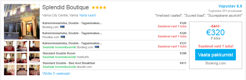 Soodsad hotellipakkumised leiad lihtsasti üles läbi hotellide hinnavõrdlusportaali HotelsCombined.com. Kuupäevadel 25.07-01.08 on võimalik leida heade reitingutega, Varna kesklinnas asuvas, neljatärni hotellis Splendid Boutique tuba kahele hinnaga 320€. See teeb öö hinnaks 23€/ in.