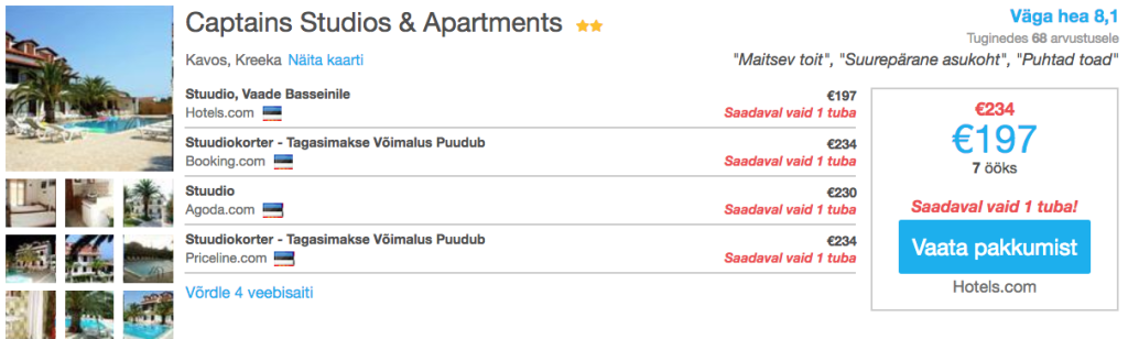 ####Hotellipakkumised KorfulOtsisime välja läbi hotellihindade võrdlusportaali Hotelscombined.ee hea reitingu ning hinnaga hotellisoovituse seitsmeks ööks vahemikus 14.06-22.06.Meie soovitus on:Captains Studios & Apartments - Basseinivaatega stuudiokorter kahele väga hea reitinguga hotellis maksab seitsmeks ööks kokku 197€. Lisainfo ja broneerimine