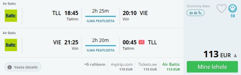 AirBaltic pakub oktoobris pileteid otselendudele Tallinnast Viini hinnaga alates 113€. Otselennud toimuvad 3x nädalas (T, N, P), kuid ümberistumisega Riias saab lennata ka teistel päevadel. Toodud hinnad on reisimiseks ainult käsipagasiga.