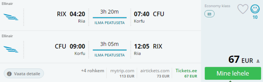 Lisaks Aegeani pakkumistele Tallinnast Kreekasse leiad hetkel ka väga soodsad lennupiletid Riiast Corfule , edasi- tagasi lennupiletid hinnaga al 67€. Üksikud lennukuupäevad saadaval juulis ja septembris. Tegemist on otselendudega!. Soodsad lennupiletid leiad läbi Momondo.ee või kasuta otselinke allpool.