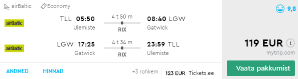 Sobivad lennupiletid Tallinnast London Gatwicki leiad lihtsasti üles läbi momondo.ee. Edasi-tagasi lennupiletite hinnad airBalticuga algavad hetkel 119 eurost: