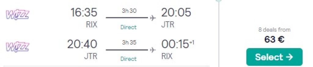 Hetkel leiad hea hinnaga lennupiletid suveks Santorinile. Edasi-tagasi lennupiletid Riiast on saadaval 63€ eest ning vähem kui sajaeuroseid lennupileteid leiab terveks suveks . Tegemist on otselendudega. Piletiteni jõudmiseks kliki allpool olevatel näidiskuupäevadel või kontrolli endale sobivaid lennukuupäevi läbi Skyscanneri.