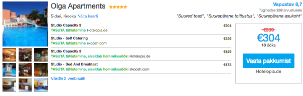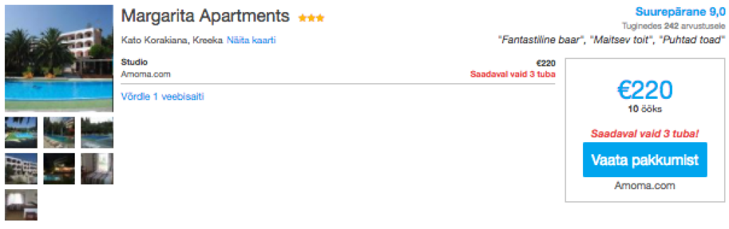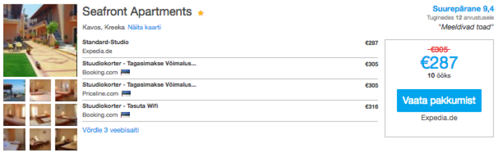 ####Hotellipakkumised KorfulKõikide kuupäevade puhul on võimalik veeta Korful 10 päevane puhkus. Otsisime välja läbi hotellihindade võrdlusportaali Hotelscombined.ee hea reitingu ning hinnaga hotellisoovitused kümneks ööks.Meie soovitused on:Seafront Apartments - Suurepärase reitinguga (Tripadvisor 5/5) mereäärne stuudiokorter kahele kümneks ööks maksab vaid 287€ ehk 144€ per person. Vaata ja broneeri tuba siit