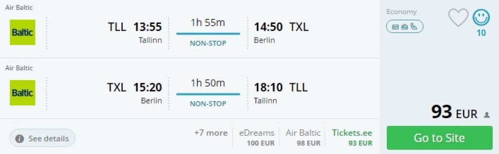 AirBaltic pakub soodsaid otselende Tallinnast Berliini hinnaga 93€ (edasi-tagasi). Lennud toimuvad 3 korda nädalas – teisipäeviti, neljapäeviti ja pühapäeviti. Pileteid leiab augusti lõpust detsembrini. Hinnas sisaldub ainult käsipagas kaaluga kuni 8 kg.