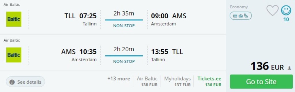 AirBaltic pakub praegu otslende Tallinnast Amsterdami hinnaga 136€. Saadavus on korralik alates märtsi lõpust kuni oktoobri lõpuni.