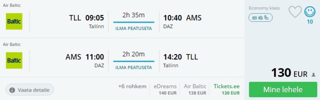 AirBaltic pakub soodsaid hooajalisi otselende Tallinnast Amsterdami. Odavaimad piletid on saadaval hinnaga 130€, kuid pole oluliselt kallimad ka muudel kuupäevadel. Hommikused lennud mõlemal suunal toimuvad iga päev perioodil 26. märts kuni 28. oktoober. Müük kuni 26. veebruarini. AirBalticu odavaimad piletid sisaldavad ainult käsipagasit.
