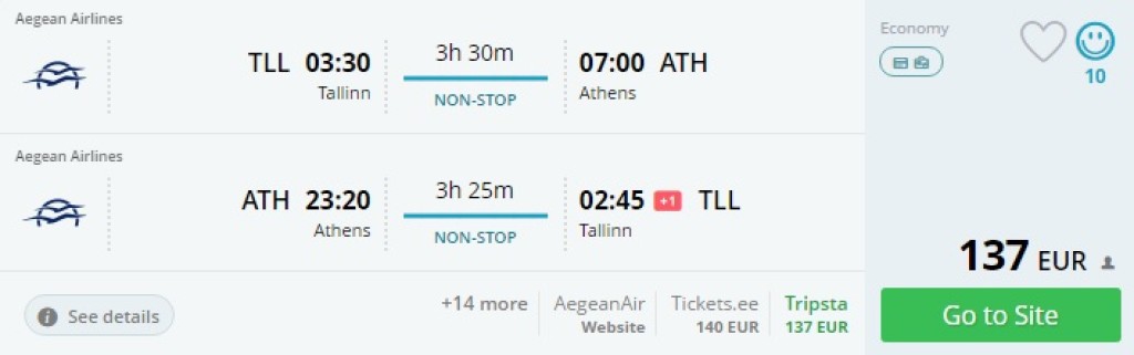 Aegean Airlines pakub otselende Tallinnast Ateenasse hinnaga alates 137€. Soodsaid lennukuupäevi on piiratud valikus augustist oktoobrini. Saadaval on ka kombinatsioon Aegean Airlinesi ja AirBalticu lendudest.