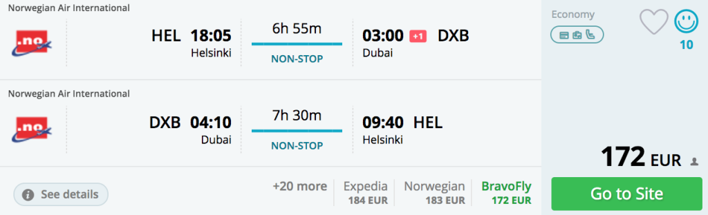 Norwegianil on hetkel müügis väga hea hinnaga lennupiletid otselendudele Helsingist Dubaisse. Edasi-tagasi lennupiletite hinnad on saadaval vaid 172€ eest. Saadavus on suurepärane ning hinnaga kuni 200€ edasi-tagasi piletite eest on saadaval ohtralt. Soodsaimad lennupiletid leiad üles läbi Momondo