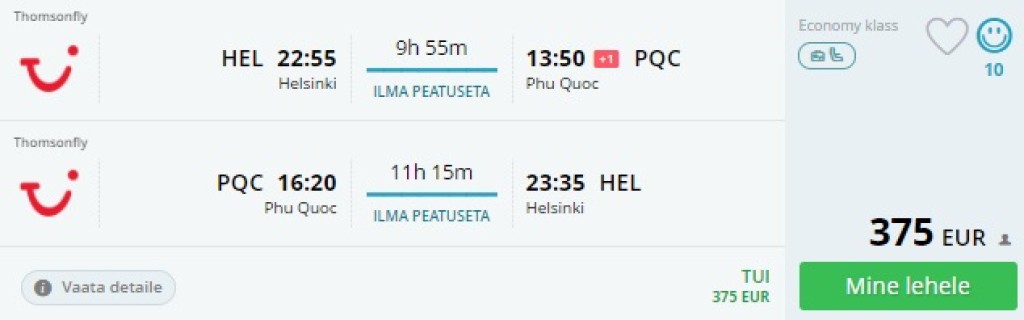 TUI pakub hetkel väga hea hinnaga lennupileteid Helsingist Vietnamisse, Phu Quoc'i saarele. Edasi-tagasi lennupiletid on saadaval alates 375€ eest ning tegemist on otselendudega vahemikus 22.03-06.04. Soodsate lennupiletite ülesleidmiseks kasuta otselinki allpool või sisesta lennukuupäevad momondosse.
