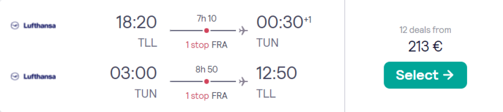 Lufthansa pakub hetkel suurepärase hinnaga lennupileteid Vahemere rannikule, Tuneesiasse. Edasi-tagasi lennupiletid Tallinnast pealinna Tunisesse on saadaval alates 213€ eest. Soodsa hinnaga lennupileteid leiab alates jaanuarist kuni maini 2023. Lennud on mõlemal suunal ühe kiire ümberistumisega Frankfurdis. Parima hinnaga lennupiletid leiad üles läbi Skyscanneri, kui aga soovid osta piletid otse lennufirmalt, siis mine Lufthansa.com ning sisesta soovitud kuupäevad otsingusse.
