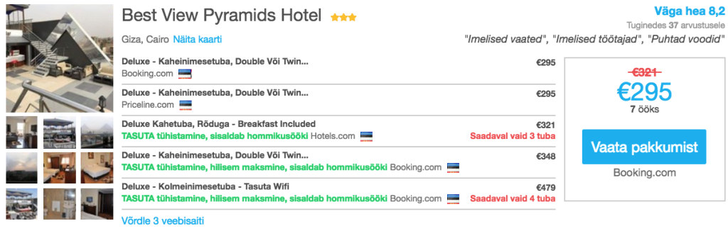 Hotellipakkumised EgiptusesParima hinnaga hotellipakkumised leiad üles läbi hotellihindade võrdlusportaali HotelsCombined.eeOtsisime välja ka mõned pakkumised nädalaks ajaks basseinidega hotellides Kairos: