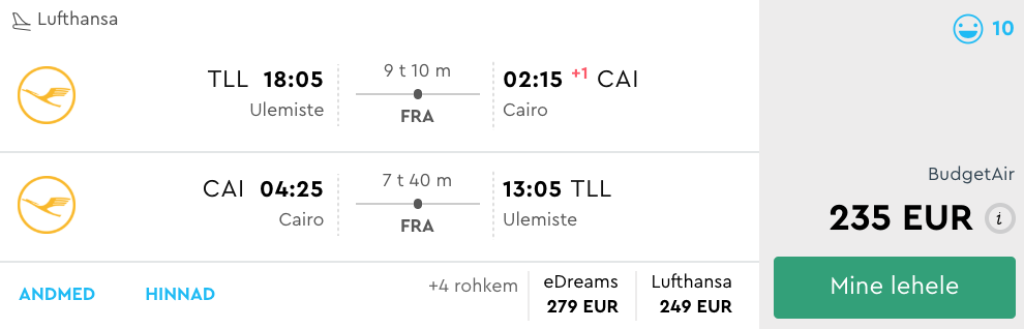 Tallinn-Kairo-Tallinn alates 235€Kõikidel meie poolt välja otsitud lennupiletitel jäävad hinnad vahemikku 235-245€. Detsembris ning jaanuaris on tulenevalt lennuplaanist tagasiteel 7h ümberistumine Frankfurdis.