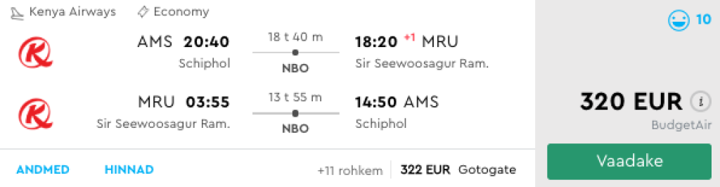 Lennud Amsterdamist toimuvad neljapäeviti, laupäeviti ning pühapäeviti ja tagasilennud Mauritiuselt Amsterdami neljapäeviti ja pühapäeviti. Kui sa allpool olevast kuupäevavalikust endale sobivaid pileteid ei leia, siis otsi endale sobivad lennupiletid üles läbi Momondo.ee