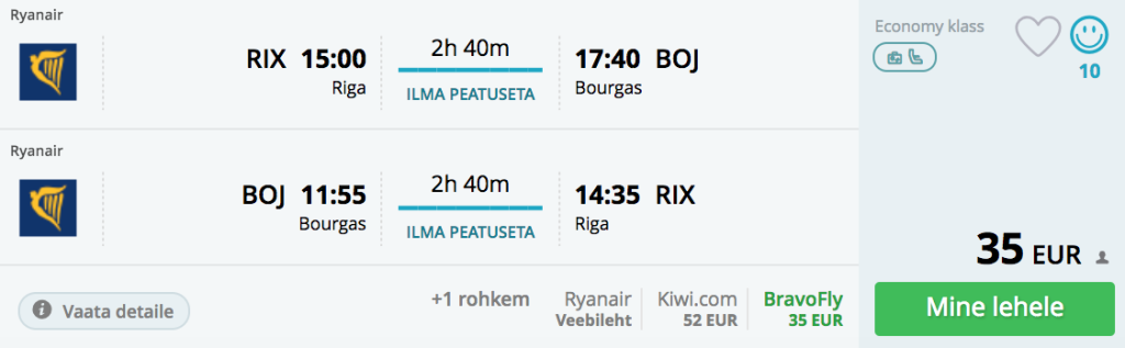 Ryanair pakub hetkel väga soodsat võimalust puhkamaks juba järgmisel nädalal Musta mere äärses Burgases. Edasi-tagasi lennupiletid Riiast Burgasesse vahemikuks 11-18.04 on saadaval vaid 35€ eest. Ilmaennustused lubavad temperatuure vahemikus 15-20 kraadi. Lennupiletid leiad läbi [Momondo.ee](http://tc.tradetracker.net/?c=23368&m=12&a=258453&u=https%3A%2F%2Fwww.momondo.ee%2Fflightsearch%2F%3FSearch%3Dtrue%26TripType%3D2%26SegNo%3D2%26SO0%3DRIX%26SD0%3DBOJ%26SDP0%3D11-04-2018%26SO1%3DBOJ%26SD1%3DRIX%26SDP1%3D18-04-2018%26AD%3D1%26TK%3DECO%26DO%3Dfalse%26NA%3Dfalse%26currency%3DEUR)ReisikindlustusSõlmi reisikindlustus PZU e-poes ja saad kuni 15% soodustust! Vaata pakkumist siit