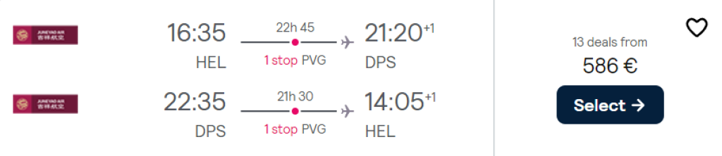 Hiina lennufirma Juneyao Airlines pakub hetkel suurepärase hinnaga lennupileteid Indoneesiasse, Bali saarele. Edasi-tagasi lennupiletid Helsingist Denpasari lennujaama on saadaval alates 586€ eest. Lennud on mõlemal suunal ühe ümberistumisega Shanghais. Miinuseks on osadel kuupäevadel tagasiteel kuskil 9h ümberistumine Shanghai lennujaamas. Eestlastele kehtib Shanghai lennujaamas viisavaba transiit, mis tähendab et võib ka korra Shanghai peale kolama minna.