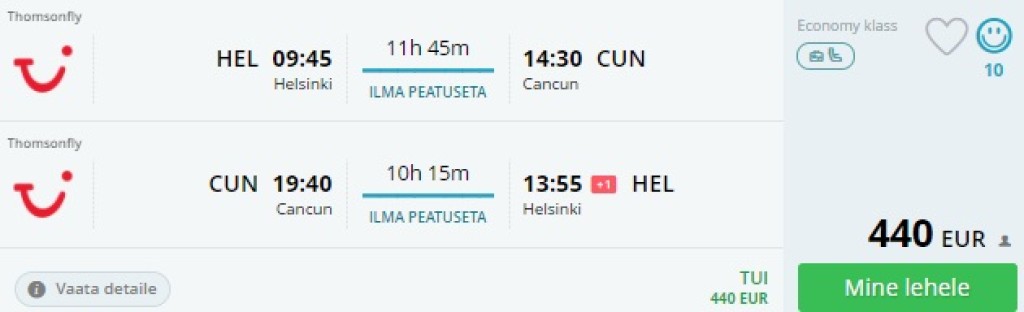 TUI pakub hetkel väga hea hinnaga lennupileteid Helsingist Yukatani poolsaarele asuvasse Cancuni! Edasi-tagasi lennupiletid otselendudele on saadaval vaid 440€ eest. Reisi pikkus on 14 päeva, mille jooksul jõuad huvi korral külastada lisaks Cancunile nii Cancunist lõunas asuvaid Tulumit, Playa del Carmenit, Cozumeli kui Isla Mujerest või Holboxi saart. Ühistransport toimib Yukatani poolsaarel hästi aga mugavaim variant on rentida auto ning parima hinnaga autod leiad üles läbi Rentalcars.com