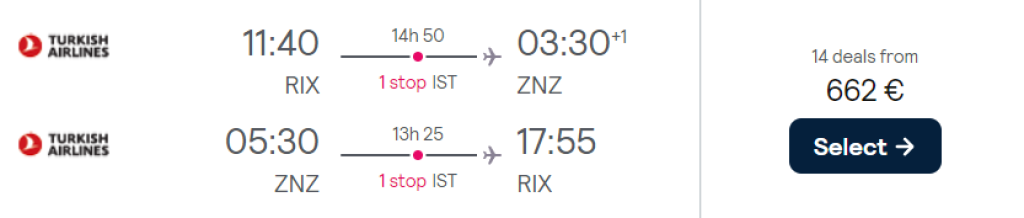 Turkish Airlines pakub hetkel suurepärase hinnaga lennupileteid India ookeanis asuvale Tansaania saarele. Edasi-tagasi lennupiletid Riiast Sansibarile on saadaval hinnaga alates 662€ eest. Soodsa hinna ja ühe kiire ümberistumisega lennupileteid leiab detsembrikuus, sealhulgas veetmaks ka jõulupühad. Ning väga hea lennupiletite saadavus on aprillis-mais 2024. Lennupiletite hinnas sisaldub nii äraantav pagas 2x23kg kui ka toitlustus lennukite pardal. Parima hinnaga lennupiletid leiab üles läbi Skyscanneri.