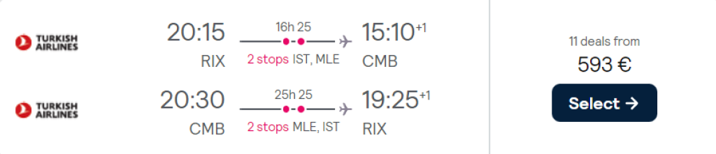 Turkish Airlines pakub hetkel väga hea hinnaga lennupileteid Sri Lankale. Edasi-tagasi lennupiletid Riiast Colombosse on saadaval alates 593€ eest ning soodsa hinnaga lennupileteid leiab aprillist juunini. Lennupiletite hinna sees on nii äraantav pagas kui ka toitlustamine lennukite pardal. Parima hinnaga lennupiletid leiad üles läbi Skyscanneri.
