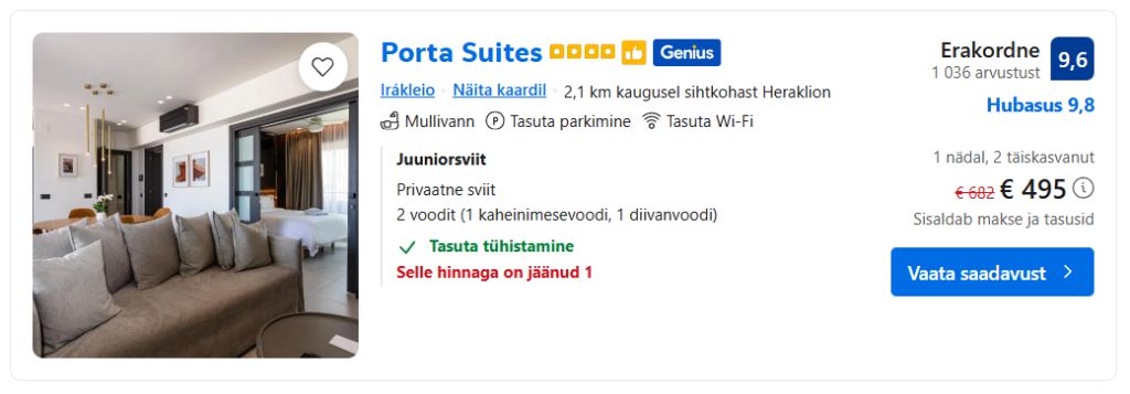Klikkides Booking.com ning broneerides sealtkaudu oma majutuse Kreetal või mujal Kreekas, toetate te Trip.ee lendude sooduspakkumiste rubriiki. Bookingul on tihtipeale ka suuri sooduskampaaniaid, kuhu saavad ligi kõik nende lojaalsusprogrammiga liitunud kasutajad.